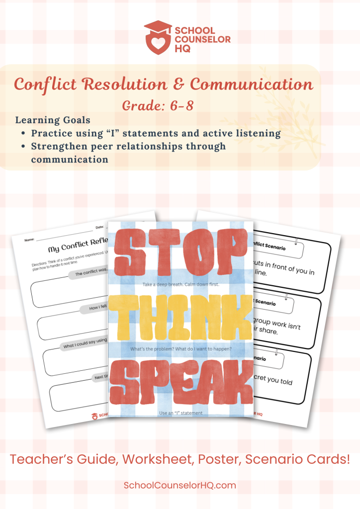 Conflict Resolution & Communication – Middle School SEL LessonBy School Counselor HQ Teach your students how to handle conflicts calmly and respectfully with this engaging SEL lesson! Conflict Resolution & Communication gives middle schoolers practical tools to recognize common conflicts, practice respectful communication, and role-play healthy solutions. This resource includes: Learning Goals: Why you’ll love it:✔️ Interactive role-play […]