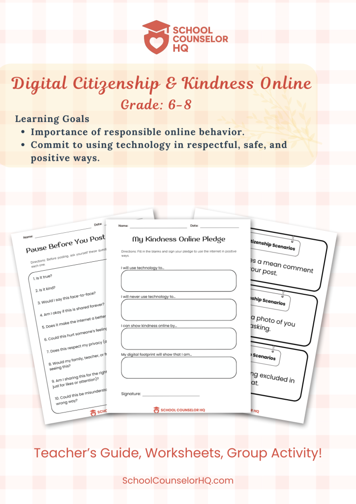 Digital Citizenship & Kindness Online – Middle School SEL LessonBy School Counselor HQ Help your students navigate the digital world with responsibility and kindness! Digital Citizenship & Kindness Online teaches middle schoolers how to think critically before posting, recognize online peer pressure, and use empathy to create a positive digital footprint. This resource includes: Learning Goals: Why you’ll […]